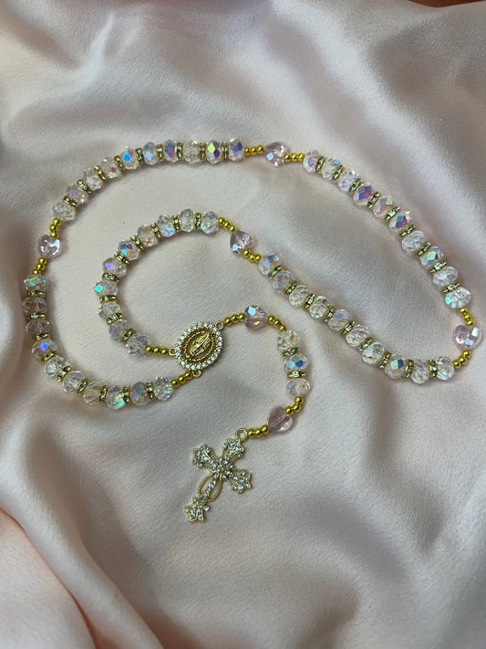 Chapelet doré et blanc avec perles texturées et croix avec cœur